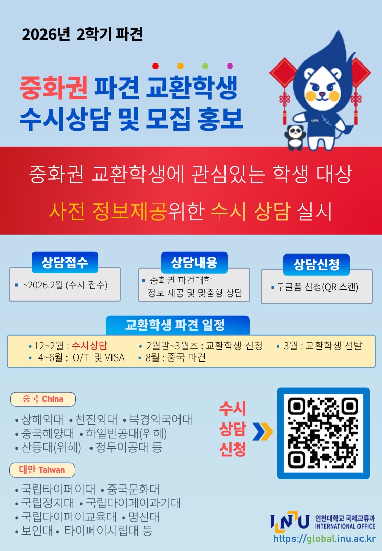 국제교류과에서는 2026년 2학기 중화권 파견교환학생 모집 활성화를 위해 수시상담을 제공하고자 하오니 학생 여러분의 많은 관심과 신청 바랍니다.