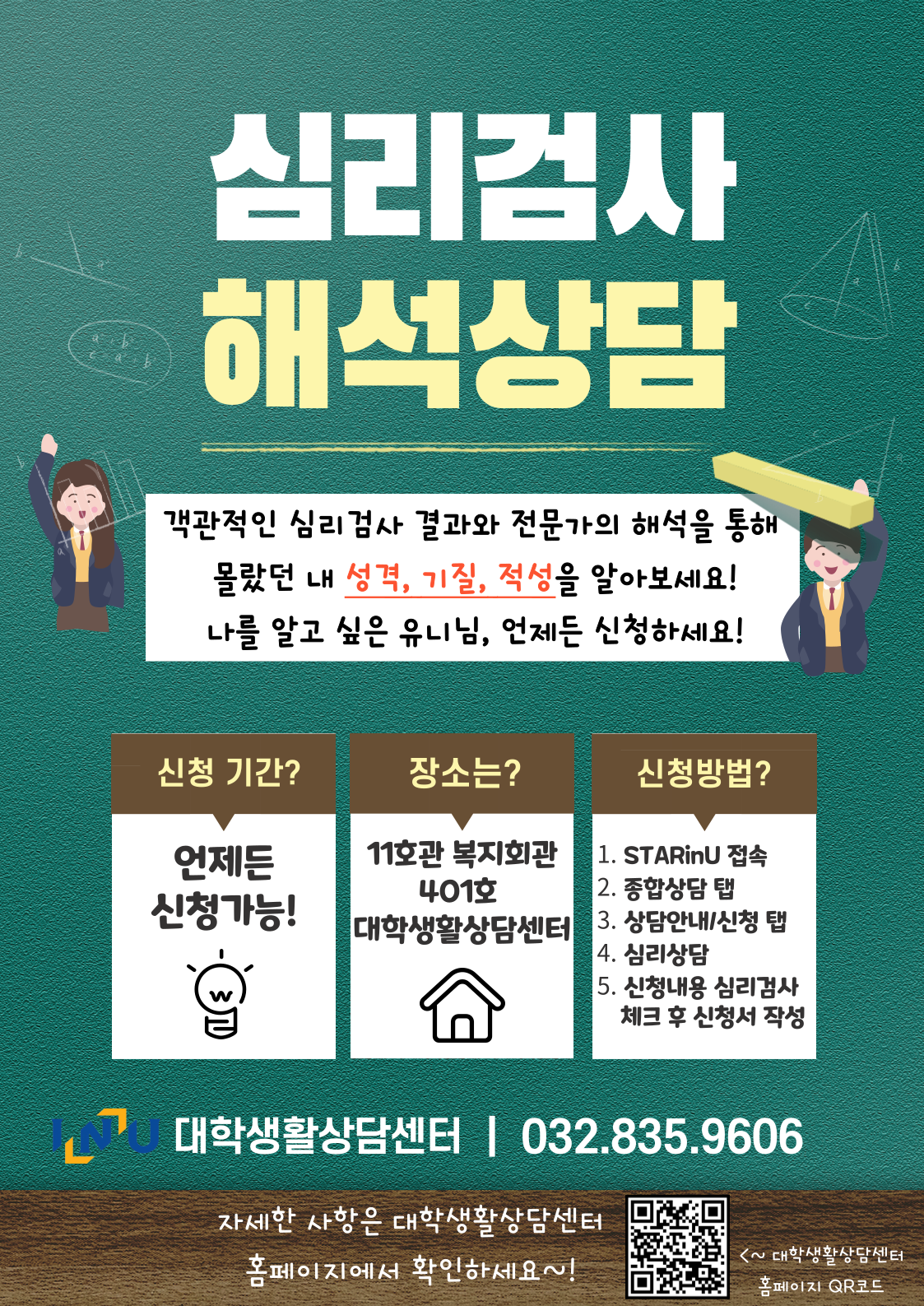 fnctId=bbs,fnctNo=1707 심리검사 해석상담 (상시신청) 글번호 420834 작성일 2026-03-09 수정일 2026-03-09 작성자 행정학과 (032-835-8330) 조회수 361 첨부파일 첨부파일이(가) 없습니다. 다음글 [국제지원과] 2026학년도 인천대학교 학부 재학생 대상 1회차(4~5월) 전화영어 수강생 모집 홍채원 2026-03-10 09:21:13.0 이전글 [[학과사무실]] [행정학과] 2026-1 담임교수 배정 안내.(변경신청: ~3/11(수) 오전9시까지, 확정예정일: 3/12) 이해영 2026-03-09 10:55:15.0 목록