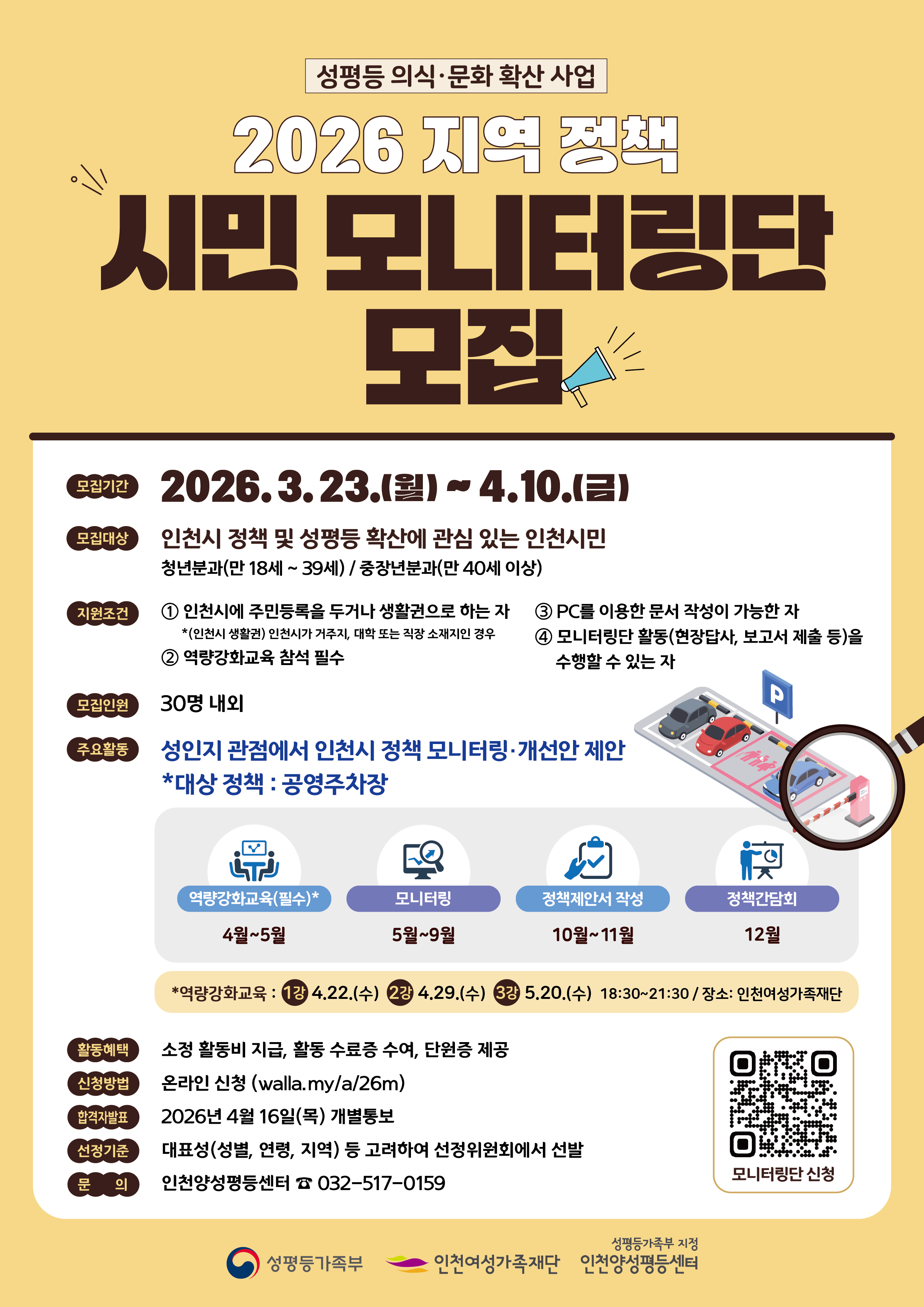 fnctId=bbs,fnctNo=1707 2026 지역 정책 시민 모니터링단 모집 (26. 03. 23. (월) ~ 26. 04. 10. (금)) 글번호 421322 작성일 2026-03-18 수정일 2026-03-18 작성자 행정학과 (032-835-8330) 조회수 121 첨부파일 첨부파일이(가) 없습니다. 다음글 2026 누리캅스 모집 (26. 03. 13. (금) ~ 26. 03. 26 (목)) 변유나 2026-03-18 13:43:33.0 이전글 [국제지원과] 2026학년도 인천대학교 학부 재학생 대상 1회차(4~5월) 전화영어 수강생 모집 홍채원 2026-03-10 09:21:13.0 목록