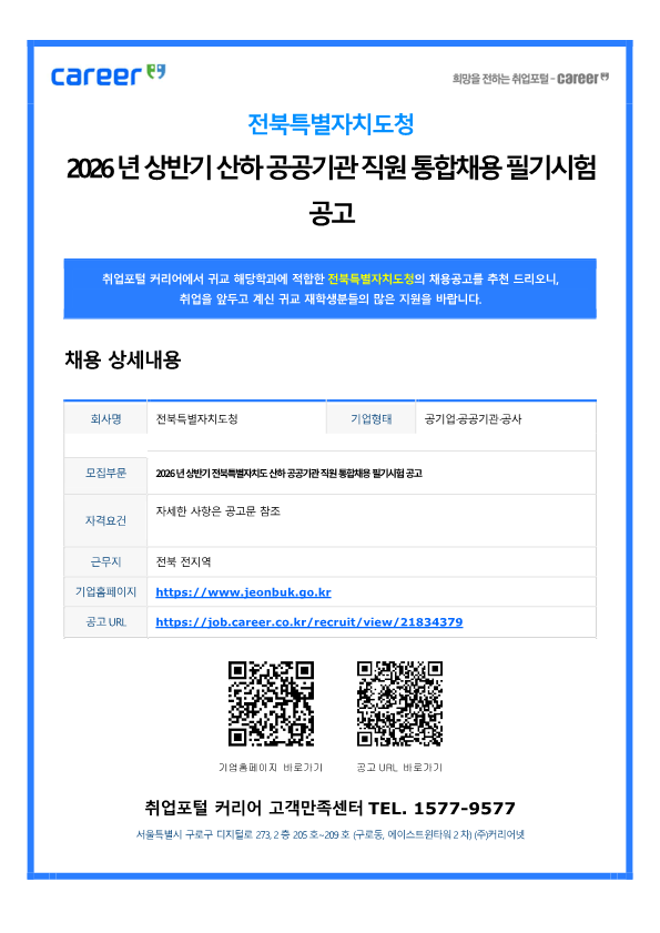 fnctId=bbs,fnctNo=1707 전북특별자치도 산하 공공기관 직원 통합채용 필기시험 공고 (4/20(월) 9:00 ~ 4/24(금) 18:00) 글번호 422391 작성일 2026-04-07 수정일 2026-04-07 작성자 행정학과 (032-835-8330) 조회수 124 첨부파일 260320_2026년 상반기 전북특별자치도 산하 공공기관 직원 통합채용 필기시험 공고.pdf 다음글 인천관광공사 일반직 공개채용 공고 (4/6(월) 09:00 ~ 4/13(월)18:00) 홍채원 2026-04-07 09:29:33.0 이전글 외교부 재외공간 공공외교 현장실습원 모집 (4/6(월) ~ 4/20(월) 오후 12시까지) 홍채원 2026-04-07 09:20:32.0 목록
