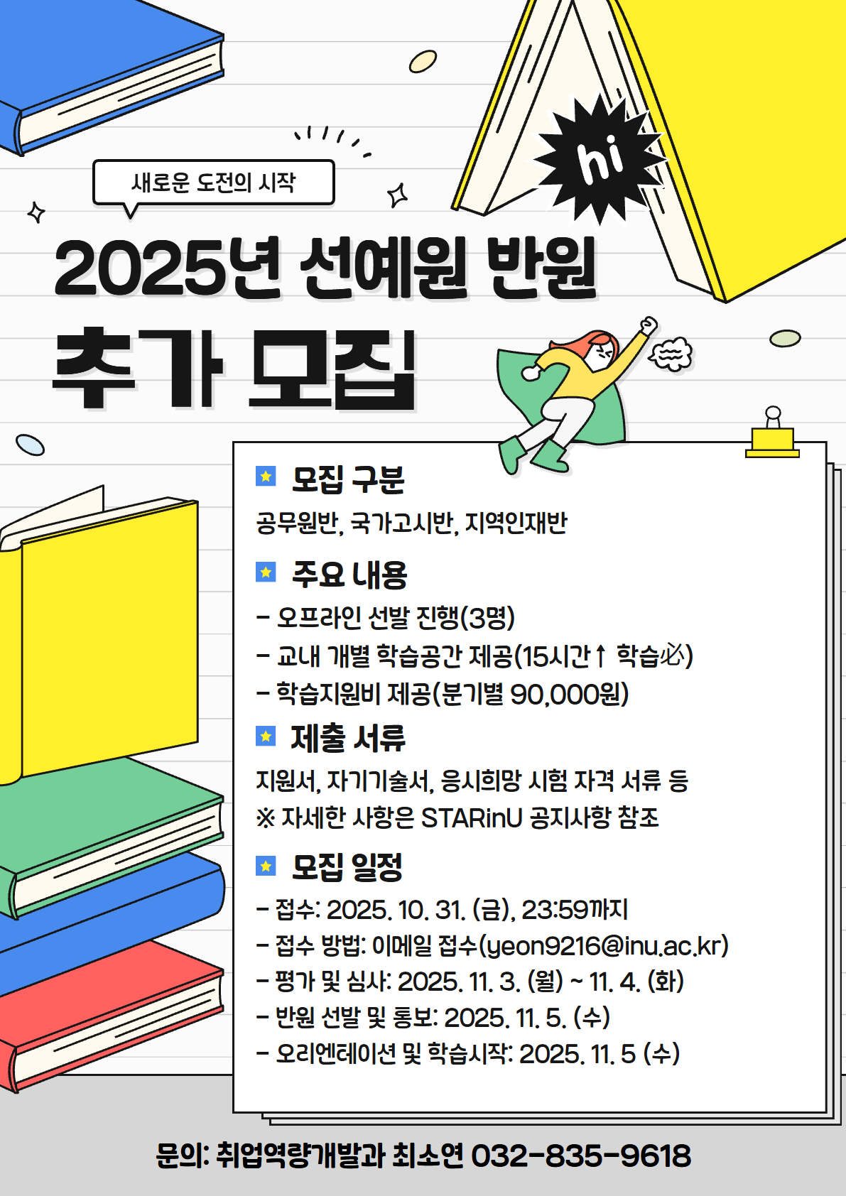 fnctId=bbs,fnctNo=1700 [취업정보] 2025년 선예원 반원 3차 추가 모집 안내 글번호 414397 작성일 2025-10-28 수정일 2025-10-28 작성자 행정학과 (032-835-8330) 조회수 18 첨부파일 첨부파일이(가) 없습니다. 다음글 이전글 [취업정보] 진로탐색 집단상담 신청안내 김보경 2025-10-24 15:13:58.0 목록